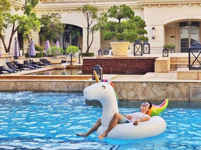 白天的瓏山林,我常錯覺自己置身義大利南方的度假小鎮。迎面的拱門、石磚、噴泉與淡黃色調的雕花牆面,以及藍色燦燦的水池,處處充滿歐風浪漫。當一跳進泳池,水花四濺,全身瞬間被沁涼包圍,秋老虎的熱氣則一掃而空。轉身,看見友人和孩子們在池中追逐,一旁室內水池裡的情侶依偎在律動水池旁,還有在養生池任泉水在背上拍打出快樂的節奏。隨後自己躺上色彩繽紛的獨角獸泳圈,悠悠漂浮在池畔,義式氛圍裡的一切,讓人心花開得更燦爛。眼前這一幅幅生動的畫面,就是度假該有的愜意啊!