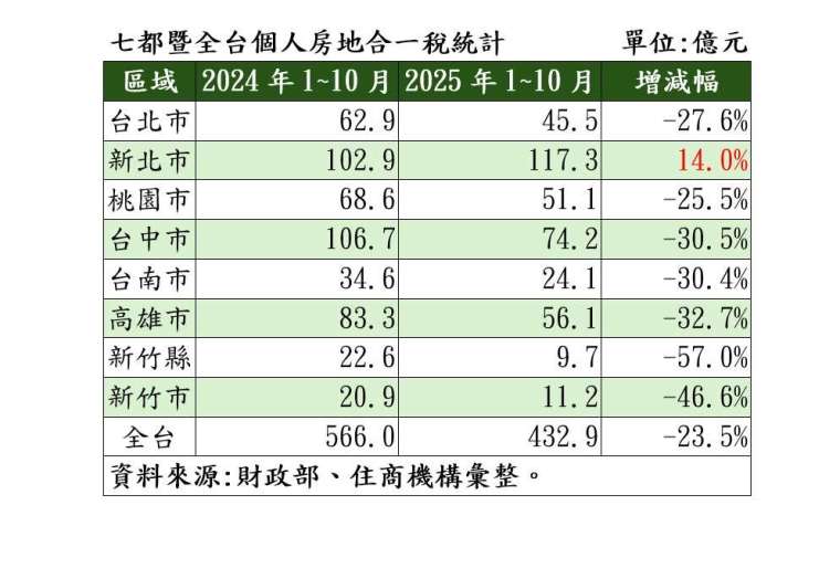 據財政部統計,台北市 1-10 月個人房地合一稅共約 45.5 億元,相較去年同期減少 27.6%;新北市則為 117.3 億元,為今年截至 10 月為止的房地合一稅收王,相較去年同期成長 14%;桃園市房地合一稅達 51.1 億元,與 2024 年同期減少 25.5%;以往為房地合一稅收王的台中市,今年 1-10 月稅收達 74.2 億元,屈居全台亞軍,與 2024 年 1~10 月相比也減少 30.5%;台南市今年截至 10 月個人房地合一稅收達 24.1 億元,與去年同期比較減少 30.4%。