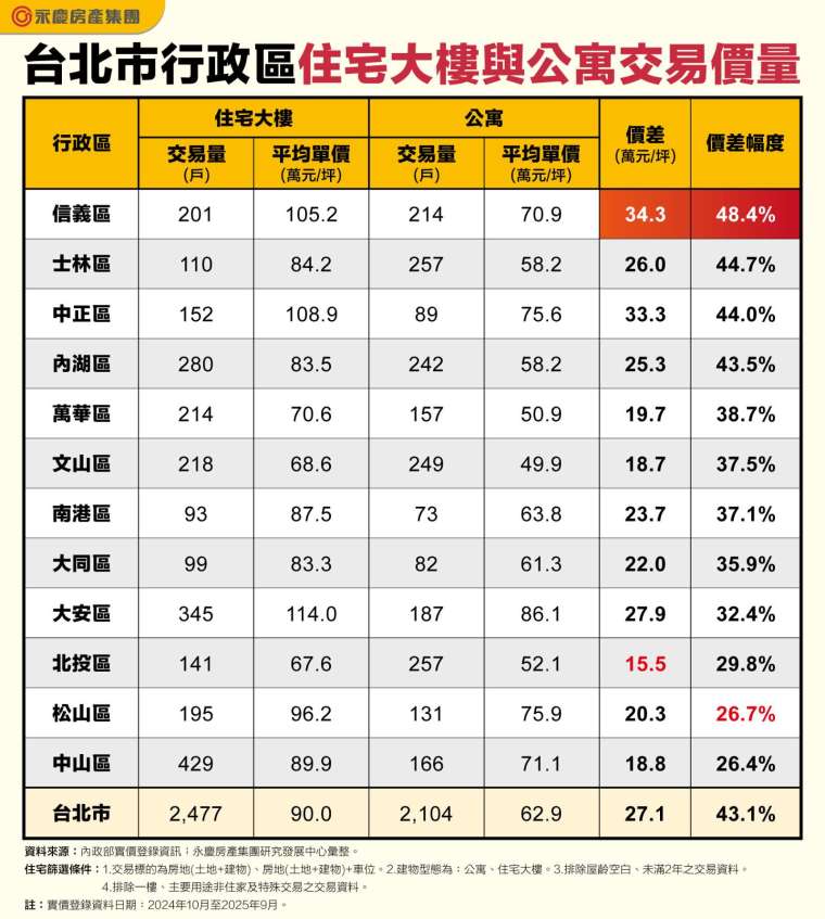 〈房產〉北市大樓與公寓比一比 信義區價差近五成、中山區價差最小