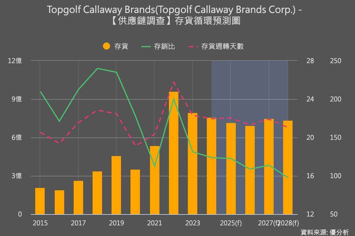 Topgolf Callaway在2025 年第三季營收9.34億美元,較去年同期下滑 7.79%,顯示需求尚未完全回溫。如下圖所示,市場預期2025至2026年還在庫存調整階段,存貨預估金額下滑。