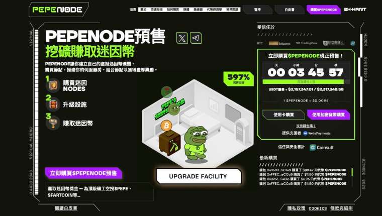 與此同時,市場中的迷因資金正在尋找新的敘事方向,Pepenode 藉由虛擬挖礦玩法與代幣銷毀機制獲得強勁關注,成為迷因領域的新興力量。當前的市場正處於結構轉移階段,PEPE 與新興專案的走勢都在塑造 2025 年的迷因生態。