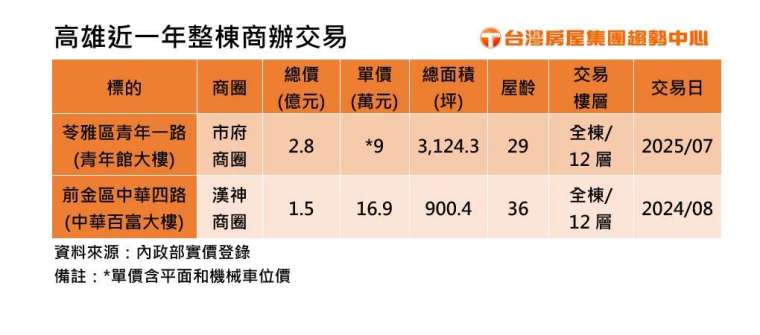高雄科技產業起飛,法人霸氣包棟買商辦。根據內政部實價登錄最新揭露,位於高雄市苓雅區青年一路的商辦大樓「青年館大樓」,今年 7 月,由設立在高雄的境外公司,以總價約 2.8 億元無貸款,將整棟 12 層樓商辦含 48 個車位一次打包,成為區域內今年以來,最高總價房地交易。