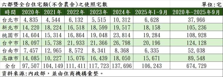 另外,2025 年 1-9 月的住宅使用執照數在台南市則是 6,335 宅,高雄市則達 1 萬 5,671 宅。賴志昶分析,觀察歷年數據,從 2022 年起使照量排行榜都由台中市奪冠,主因是該市近年有捷運等建設議題,且北屯、西屯及南屯等處重劃區議題濃厚,相繼成為建商推案重鎮,推升區域使照量體;另在新北、桃園方面,則受惠於「脫北者」議題,以親民房價與軌道建設題材,加諸有不少重劃區集中兩縣市,吸引建商近年來大舉推案。