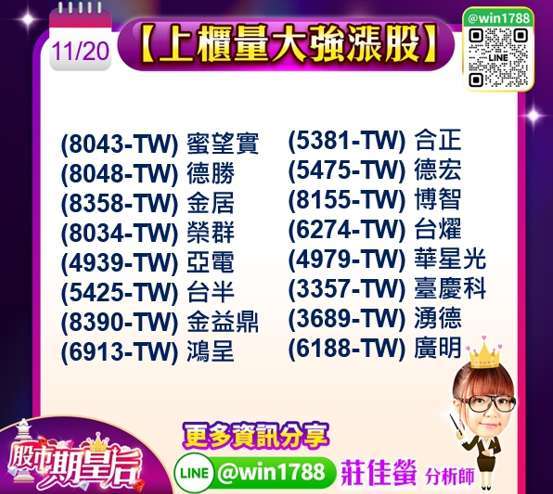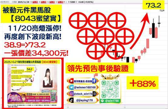 蜜望實 (8043-TW),38.9=>70.8 領先預告後大漲 +82%,主要代理日本知名被動元件品牌,深耕電子零組件通路,在智慧裝置需求成長的帶動下,營運動能持續強化,近期月營收表現亮眼,10 月營收年增高達 59%,並連續 45 個月創下新高,基本面動能相當扎實,技術面上,多頭訊號明確,吸引法人積極布局,近期被動元件族群整體抗跌,蜜望實在基本面成長、法人買盤與技術面強勢共振下,成為盤面焦點。