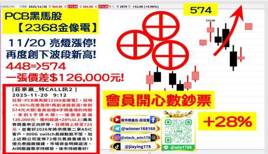 PCB 大廠(2368-TW)金像電,456.5 => 574 領先預告後大漲 +28%,受惠 AI ASIC 訂單持續湧入,營運展望再度獲得外資提升信心,美系外資最新報告大幅上修目標價至 725 元,並指出金像電在 AWS Trainium 3 的市佔率可望從上一代 Trainium 2 的 50% 跳升至 60%–70%,顯示產品競爭力持續強化,相關 CCL/PCB 將於今年 12 月開始少量出貨,2026 年 3–4 月正式大量供應,進度完全符合市場預期,此外,金像電也有望成為 Google TPU 的主要供應商之一,美系外資預估 2026 年市佔率將不低於 20%。隨著 HVLP 四層銅箔的採用,新一代 ASIC 與 TPU 產品所需 PCB 價值同步提升,單價較上一代增加逾 20%,且比市場普遍預期高出超過 40%,將為金像電帶來更強勁的 ASP 與獲利動能,看好隨著 AI 伺服器需求加速成長,金像電在高階 PCB 的布局將持續放大中長線成長空間。