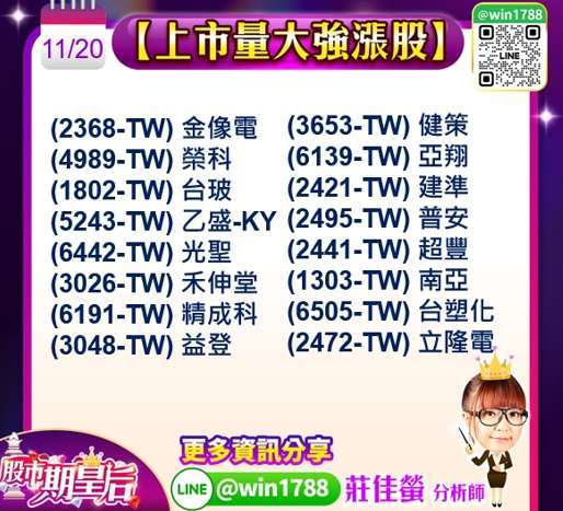 盤面上強勢的族群如佳螢所說,在不確定因素如美國科技財報與國際政策逐步明朗後,台股將走自己的路,回歸基本面,11 月份具備漲價、缺貨題材的類股持續成為盤面主流,今日走勢再度驗證,短線雖須留意聯準會政策變化,但整體資金動能仍偏向科技與 AI 相關供應鏈,此外,市場焦點也在於明日登場的