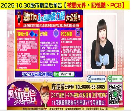 2025.10.30 股市期皇后領先預告,11 月份漲價三部曲,被動元件、記憶體、PCB,將會成為 11 月份主流! 再度驗證!