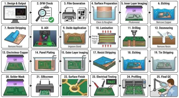 Nano Banana Pro 不僅能生成藝術作品,還能理解各種專業知識,例如輸入蝕刻、層壓、鑽孔等這 25 個步驟為提示詞,接著就能產生關於「PCB 電路板製造全流程」 的圖:
