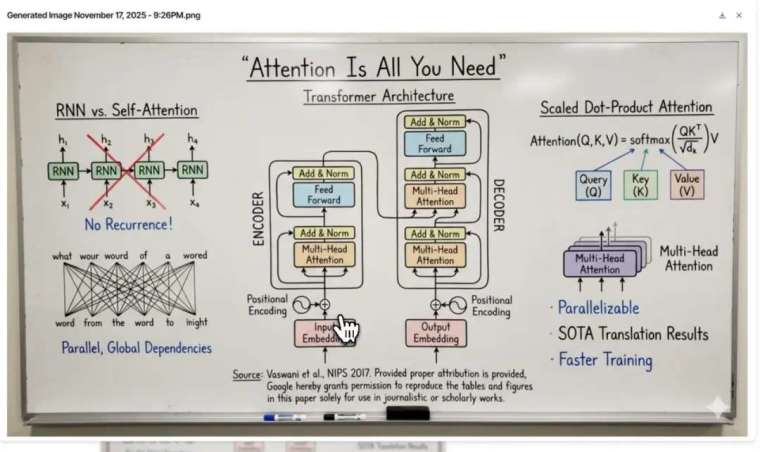 例如,把《Attention Is All You Need》論文上傳後,輸入提示詞:「把這篇論文變成教授的白板板書圖像:要有圖解、箭頭、框圖,以及解釋核心概念的視覺說明。使用彩色繪製。」成果如下: