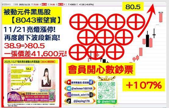 (8043-TW) 蜜望實,38.9=>80.5 領先預告後大漲 +107%,主要代理日本知名被動元件品牌,深耕電子零組件通路,在智慧裝置需求成長的帶動下,營運動能持續強化,近期月營收表現亮眼,10 月營收年增高達 59%,並連續 45 個月創下新高,基本面動能相當扎實,技術面上,多頭訊號明確,吸引法人積極布局,近期被動元件族群整體抗跌,蜜望實在基本面成長、法人買盤與技術面強勢共振下,成為盤面焦點。