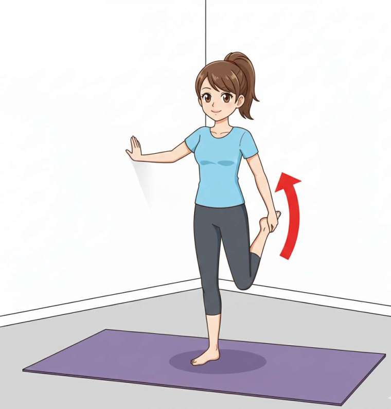 2. 用同側手抓住腳踝將腳跟拉向臀部,感受大腿前側的拉伸。保持骨盆中立。