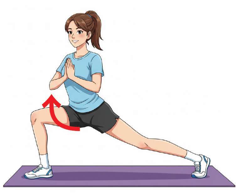 1. 一腳向前邁出成弓箭步,膝蓋不超過腳尖,後腿伸直。