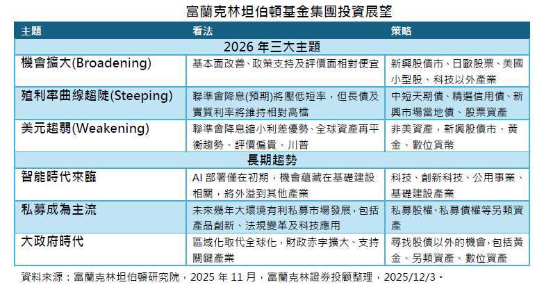富蘭克林坦伯頓基金集團 2026 年看好三大主題,包括: