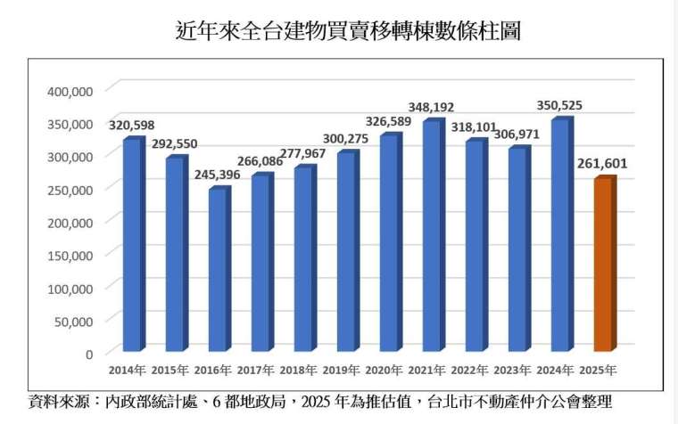 台北市不動產仲介公會根據全台六都最新發佈的前 11 個月房屋買賣移轉棟數推估,2025 年全台全年房屋交易量大概會落在 26 萬 1, 601 棟上下,算是勉強守住 26 萬棟大關卡,但與 2024 年 35 萬棟比較,大幅衰退了 25.4%,交易量創下近 9 年來新低紀錄。
