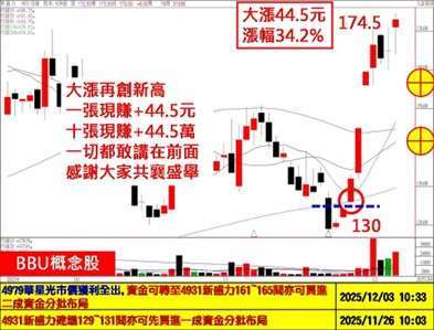 BBU 概念股新盛力 (4931-TW):11/26 日 130 元全力鎖定、12/3 日 161~165 元間再買→今日再創 174.5 元新高,一張價差達 + 44.5 元、獲利幅度達 + 34.2%,恭喜大家!持多續抱續賺不變。