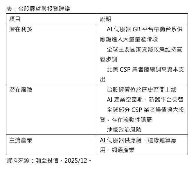 台股今年漲勢強勁,第四季開始進入震盪格局。展望 2026 年第一季,瀚亞投信表示,持續看好 AI 產業向外擴散,但明年上半年需留意新舊產品交替的空窗期與地緣政治風險。目前台股評價已來到歷史區間上緣,市場存在拉回風險,盤勢看法偏中性,建議拉回時可尋找買點。