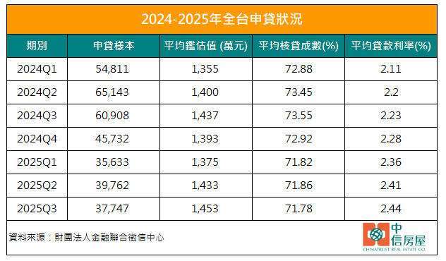 根據聯徵中心最新公布的 2025 第三季房貸統計顯示,在第三季新增的 3 萬 7,747 個申貸樣本中,平均房貸利率已上升至 2.44%,寫下聯徵中心自 2009 年公布統計以來的新高。平均核貸成數也降至 71.78%,創下近 22 個季度以來的新低,顯見銀行審核房貸的態度愈發謹慎。