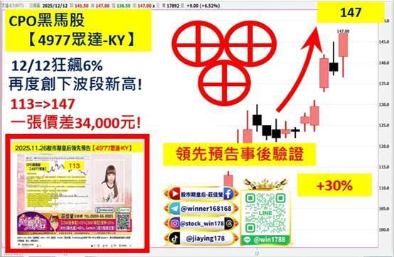 (4977-TW) 眾達 - KY,不僅是博通的供應鏈,更是 GEMINI3 的黑馬,外資投信持續進場下,11 月 合併營收 1.01 億元,創近 2 個月以來新高,股價當然噴出大漲! 會員獲利 ING! 法人圈上看目標價 172 元,未來成長空間非常大。
