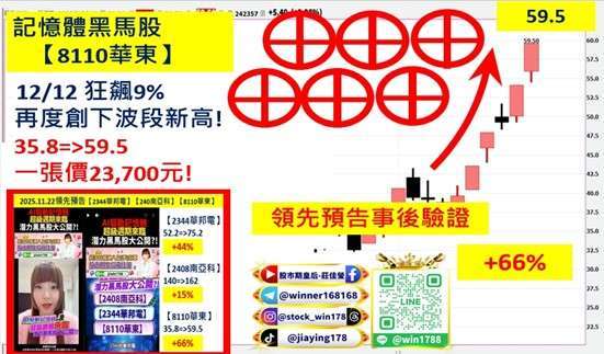 (8110-TW)華東,35.8=>59.5,領先預告後大漲 66%,專注於 IC 封測服務,屬電子零組件產業體系,總市值逾百億元,為中型股典型代表,公司主要提供功率元件、感測元件封裝與測試,為國內晶片客戶提供垂直整合封測方案,營運方面,華東 11 月合併營收 1,187 百萬元,月增 15.1%、年增 26.9%,創近 25 個月新高,反映半導體回補庫存效應發酵,訂單持續增長,前 11 月營收合計 11,268 百萬元,年增 8.3%,顯示基本面逐季回穩,華東與 (2344-TW) 華邦電連動度高,隨其產能擴張,接單動能同步增強,今年前三季在業外助攻下已轉盈,每股純益 1.29 元,法人預期第 4 季本業改善可期,明年營運表現有望優於今年。