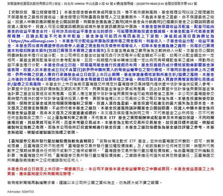 安聯投信繼第三季首檔主動式 ETF 00984A 安聯台灣高息成長主動式 ETF 基金 (本基金之配息來源可能為收益平準金且並無保證收益及配息) 正式掛牌後,再度推出同樣是聚焦台股、但採不同策略的安聯台灣主動式 ETF 基金 (本基金之配息來源可能為收益平準金) ,寄望提供投資人不同的主動式 ETF 投資解方。