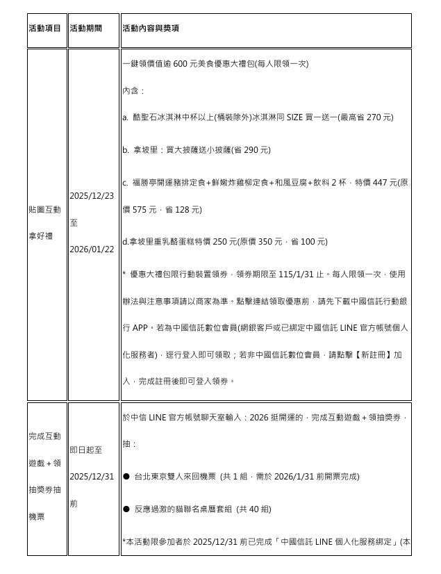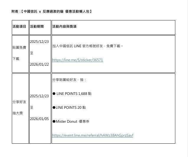 首波強打:分享貼圖抽 LINE POINTS 1,688 點,互動即享 600 元禮包,有機會再抽台北東京雙人來回機票。中信銀行 LINE 官方帳號長期以來透過個人化通知服務,平均每月傳遞超過 8,800 萬則訊息,是生活中不可或缺的金融小幫手。為了慶祝好友數突破千萬,2025 年 12 月 23 日起加入中國信託 LINE 官方帳號好友即可免費下載 8 款實用又療癒的貼圖,下載限時至 2026 年 1 月 22 日止。更加碼推出分享回饋,於 2026 年 1 月 5 日前,透過 LINE 活動網頁將貼圖分享給好友,就有機會抽中最高 LINE POINTS 1,688 點及 Mister Donut 優惠券,讓你動動手指就能送祝福再賺好康。