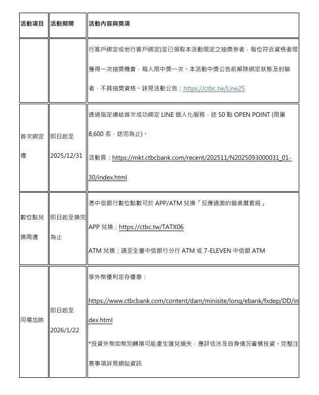 針對尚未綁定中信銀行 LINE 個人化服務的新朋友,中信銀行祭出限時見面禮。即日起至 2025 年 12 月 31 日止,透過指定連結首次成功綁定 LINE 個人化服務,直接送 50 點 OPEN POINT(限量 8,600 份)。