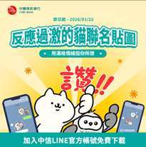 中國信託 LINE 好友數已突破千萬大關!中國信託銀行 (簡稱「中信銀行」)為感謝全臺千萬好友的支持,宣布與日本超人氣角色「反應過激的貓」聯手合作,推出「中國信託 X 反應過激的貓 這也挺過頭了吧!」聯名動態貼圖。反應過激的貓這次不只浮誇,更化身為你的最強應援團,貼圖不只是日常萬用的問候,還有跨年必備的祝福,讓你和朋友的對話更動感有趣!無論你是想躺平、斜槓還是正在努力奮鬥,中信銀行都用行動告訴你:「挺你所想,就是要挺到底!」2025/12/23 起加入中信銀行 LINE 官方帳號好友即可免費下載,更祭出「分享貼圖抽點數紅包」、「參與 LINE 互動領禮包」與「綁定 LINE 官方帳號抽機票」三大回饋。
