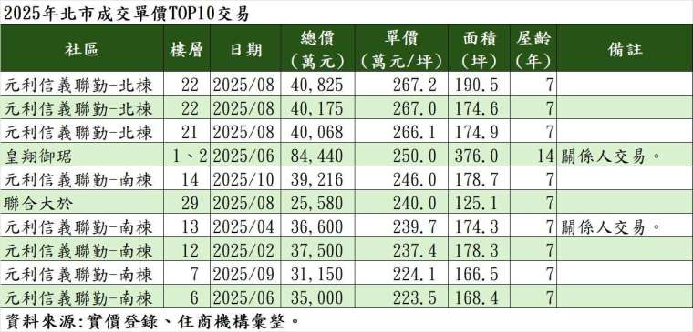 根據數據,「元利信義聯勤 - 北棟」屋齡約 7 年,22 樓 2 戶於 8 月中旬同日成交,2 戶總面積共達 365.1 坪,成交總價共 8.1 億元,平均成交單價約 267.1 萬元。經查,該案為自然人取得,且 2 戶皆無貸款;另根據實價,台北市成交單價前十名交易中,就算包含關係人交易,其中也有高達 8 筆交易是來自「元利信義聯勤」,其餘 2 筆則是信義區豪宅「皇翔御琚」與「聯合大於」。