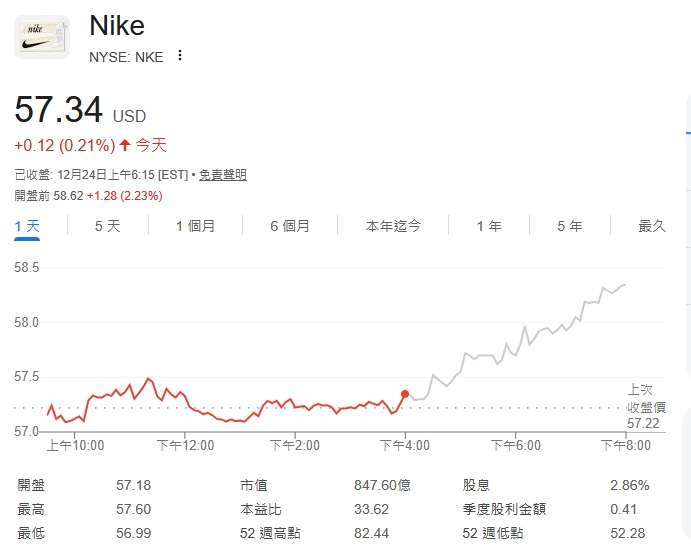 根據提交給美國證券交易委員會 (SEC) 的申報資料,庫克目前持有 Nike 股票約 10.5 萬股。Nike 股價周二收盤小幅上漲 0.2%,報 57.34 美元,盤後續揚約 1% 至 57.90 美元。市場人士指出,在基本面仍待改善之際,董事級高層的實際買進行動,對投資人情緒具有一定安定效果。