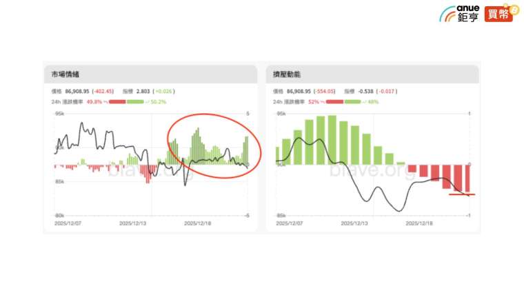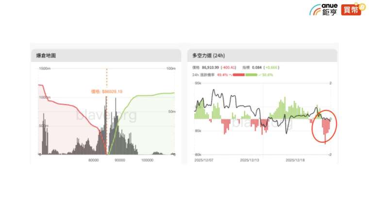 清算地圖數據則顯示,多空比例相差不大,上方最大爆倉壓力位於 9 萬美元附近,下方則集中於 8.6 萬美元,尤其下方恐先被清算! 多空力道小幅翻正,指標恢復正值,但放量不足,表示追多力道有限,仍需觀察是否能持續放大與籌碼形成共振。比特幣目前處於反彈後的高位震盪結構,雖然情緒改善,但籌碼與動能尚未轉多,短線仍須提防誘多後的急跌風險,建議投資人仍以高拋低吸策略為主。