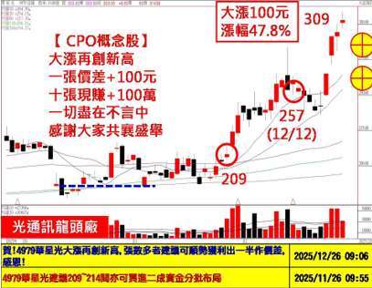 隨著年底作帳行情持續加溫,投信及內資法人為了拚績效,很明顯今日表現最強的股票仍是落在相關 AI 族群強勢的中小型轉機成長股為主,譬如探針卡三雄精測 (6510-TW)、穎崴(6515-TW)、旺矽(6223-TW)、PCB 概念股金像電(2368-TW)、凱崴(5498-TW)、鉅橡(8074-TW)、電源供應器環科(2413-TW)、玻纖布富喬(1815-TW)、德宏(5475-TW)、ABF 景碩(3189-TW)、矽光子華星光(4979-TW)、特化族群晶呈科(4768-TW)、三晃(1721-TW)、自動化設備高僑(6234-TW)、大量(3167-TW)、竑騰(7751-TW)、記憶體族群凌航(3135-TW)、晶豪科(3006-TW)、點序(6485-TW)、方土昶(6265-TW)、利機(3444-TW)、封測華泰(2329-TW)、力成(6239-TW)、矽格(6257-TW)、欣銓(3264-TW)、南茂(8150-TW)、典範(3372-TW)、台星科(3265-TW)、環污設備華景電(6788-TW)、以及第一銅(2009-TW)、恩德(1528-TW)、圓剛(2417-TW)、圓展(3669-TW)、榮昌(3684-TW)、鴻碩(3092-TW)、豪勉(6218-TW)、律勝(3354-TW)、旭軟(3390-TW)、大立光(3008-TW) 等跌深股,今日表現都相當地強勢;不過,大師兄還是要提醒大家:對於某些累積漲幅已大的個股,年底作帳拉高之後,可能恐須提防結帳賣壓的出籠,不可不慎!