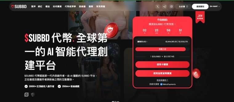 SUBBD 代幣用於訂閱、小費、專屬內容與搶先體驗 AI 功能,並提供忠誠獎勵與平臺福利,目前預售已售出逾 144 萬美元,代幣價格為 0.05745 美元,採遞增定價機制,早期進場具折扣空間。