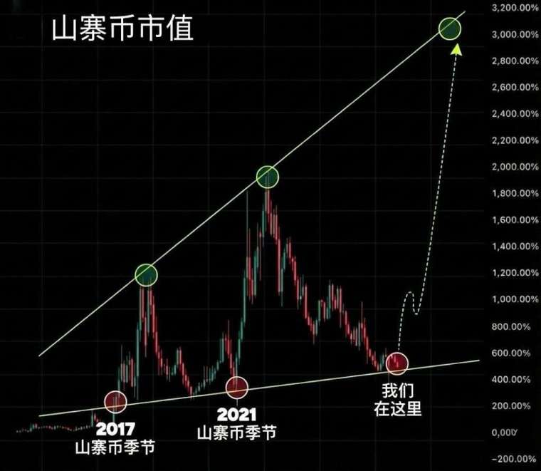 圖中虛線箭頭大膽預測未來走勢,指出若歷史重演,山寨幣總市值可能出現類似前兩次的垂直式拉升,最終在上方趨勢線附近達到加速段的頂部。圖表右側軸線顯示潛在漲幅可能達 3000% 以上,代表下一輪大週期中,山寨幣市場規模可能遠超目前水準。