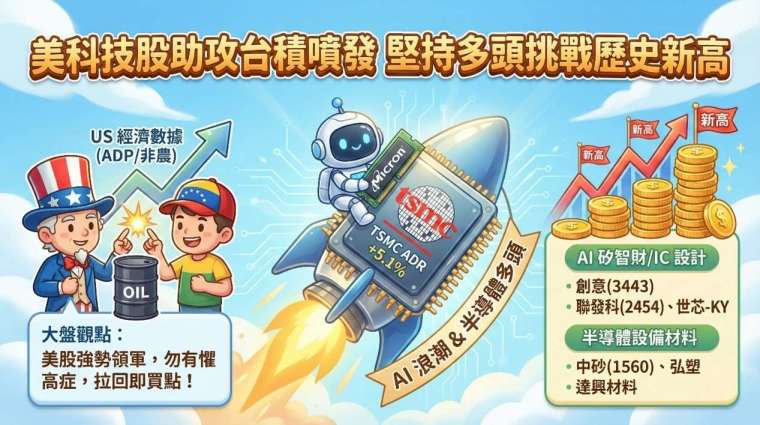 台股大盤:美股科技巨頭助攻,經濟數據成攻頂關鍵 回顧上周五晚間,美股科技股氣勢如虹,記憶體大廠美光(Micron)、台積電 ADR 及日月光 ADR 全面大漲,這股強勁的半導體多頭氣勢將直接傳導至台股,預期本周加權指數將持續挑戰歷史新高。短線上,多頭攻勢能否延續的關鍵指標,在於本周三(1/7)公佈的「小非農」ADP 就業數據,以及周五(1/9)的非農就業與失業率數據。若數據能符合市場預期,顯示經濟軟著陸態勢不變,美股勢必再次領軍衝鋒。在此提醒投資人,面對如此明確的多頭趨勢,千萬別犯了「懼高症」而預設高點,市場往往在猶豫中上漲,「感覺漲多」並非賣出理由。記住,趨勢對了,今天的高點往往是明天的低點,務必堅持做多思維,才能擁抱波段獲利。