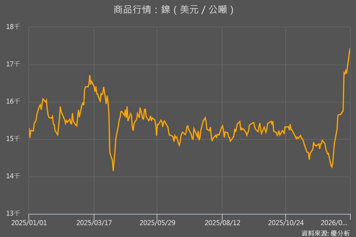 鎳價則在印尼供給政策預期帶動下明顯反彈。市場傳出,印尼政府可能於2026年將鎳原礦生產配額,較今年水準最多削減34%,供給收縮疑慮升溫。