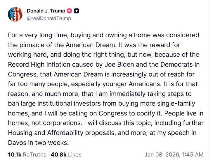 川普強調,「房子是給人住的,不是給企業的」,並表示將在兩週後於達沃斯發表演說時,進一步說明住房與可負擔性相關政策。此番言論正值美國房市連續第三年處於 30 年來最低銷售水準,住房政策再度成為市場與政治焦點。川普此前也曾於去年 12 月表示,將在 2026 年初宣布「美國史上最激進的住房改革方案」。