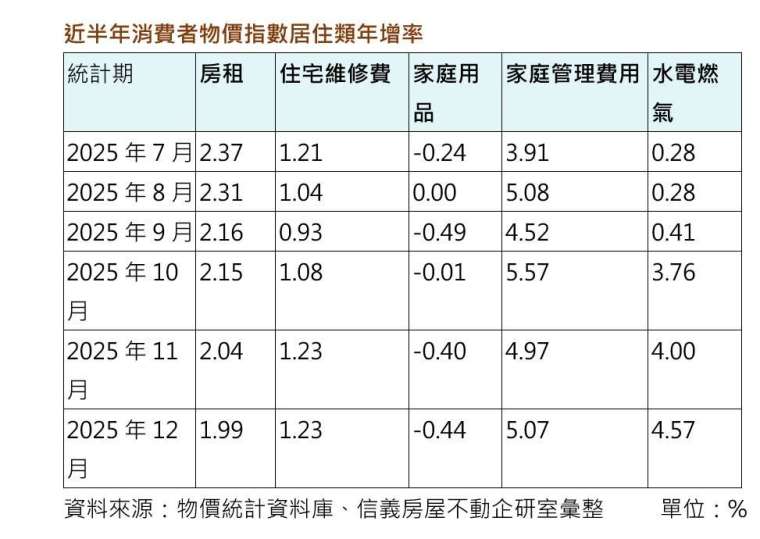 統計顯示,12 月的房租指數年增率 1.99%,是近 29 個月以來首度跌破 2%,房租漲勢似乎有趨緩現象,不過觀察年度的房租指數表現,2023 年房租指數年增 2.16%,2024 年年增 2.45%,2025 年年增 2.3%。
