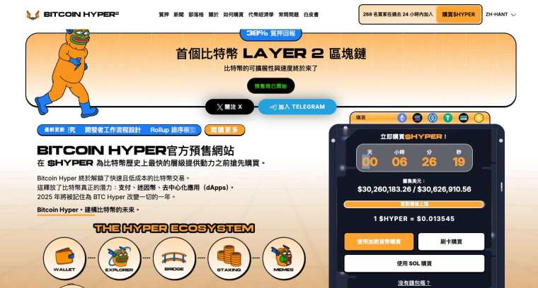 Bitcoin Hyper($HYPER)代幣的預售在尚未結束前已累積突破 3,000 萬美元,這個數字不僅代表資金高度集中,也顯示出比特幣 Layer2 敘事在 2026 的強勢回歸。其采用 Solana 虛擬機設計,使比特幣主網能首次以極低成本與高速度處理智能合約、遊戲、支付與模因相關應用。這種結構上的融合,使比特幣長期以來的不可編程限制得到突破,讓 BTC 真正具備跨鏈價值捕捉能力。