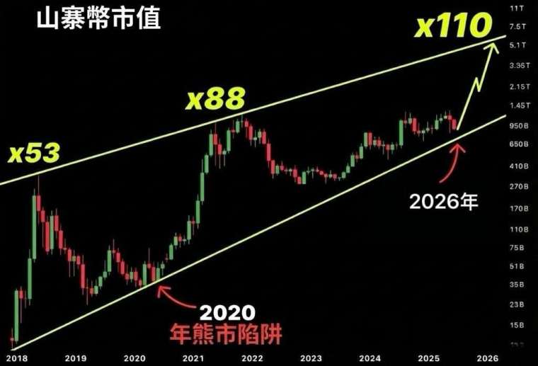 綜合圖表訊號與分析師解讀,這是一種以長期上升通道為骨架,再用 2020 分形作為節奏參考的週期分析。核心結論指向同一件事,目前山寨幣總市值位於通道支撐帶附近,結構上具備從低位區向通道上緣回歸的條件,若後續走勢延續通道內的上升節奏,2026 可能出現更強的上行段落,並將總市值目標推向 5 萬億以上的想像區間。
