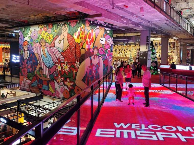 不過,相較於其他商場著力於泰國在地文化和流行時尚的藝術巧思結合,The EmQuartier 集團則是第一個將「綠色」和「永續」概念融入商業賣場和延伸出周遭環境,落實「自然與未來對話」的新都市哲學綠色旅遊商圈。特別是他們的中央庭院與垂直花園,利用自然光線與開放空間設計,呈現人與環境共存的理念。而內部旋轉樓梯如雕塑般的造型,則成為社群媒體打卡的熱門景點。再沿著 The EmQuartier 和 BTS 空鐵站的「綠植天橋」來到 EmSphere Bangkok,這間商場則以 LED 大道和中心 Market 的季節性大手筆造景聞名。每逢新季節,商場以燈光、植物與藝術裝置打造令人驚嘆的景觀,吸引遊客駐足,整個商場如巨大的藝術舞台,光影隨人群移動而變化,每一刻都值得被紀錄。