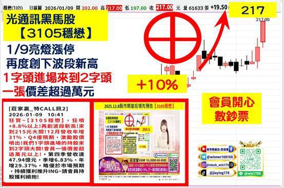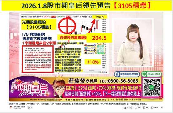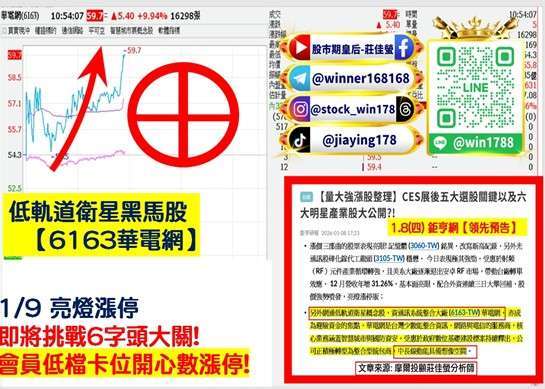 今日盤面最耀眼的明星莫過於佳螢老師點名預告的五大主流中的,光通訊股以及低軌道衛星股;「低軌道衛星」與「5G/6G 國家隊」,指標股 (6163-TW) 華電網, 今日強勢亮燈漲停,不僅突破盤整區間挑戰前高,更因打入「台灣次世代通訊產業聯盟」而備受關注,法人看好其 2025 年第三季 EPS 成功轉虧為盈後的轉機爆發力,加上政府對數位基建的持續挹注,華電網已成為元月紅包行情的代表作。