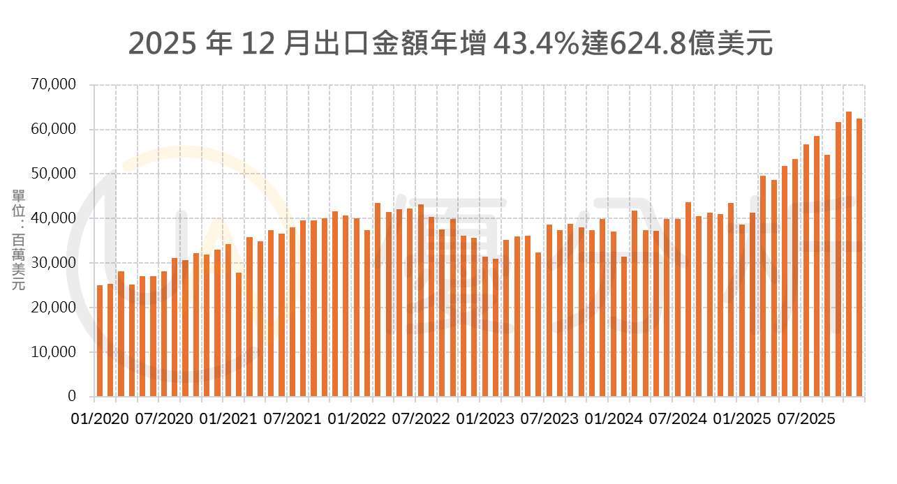 就 12 月份表現來看,出口額達到 624.8 億美元,年增率為 43.4%,這已是連續第 26 個月呈現成長。儘管部分輸美產品面臨 20% 的關稅,但半導體目前並未受此限制,台灣正與美國協商以期降低這些關稅。