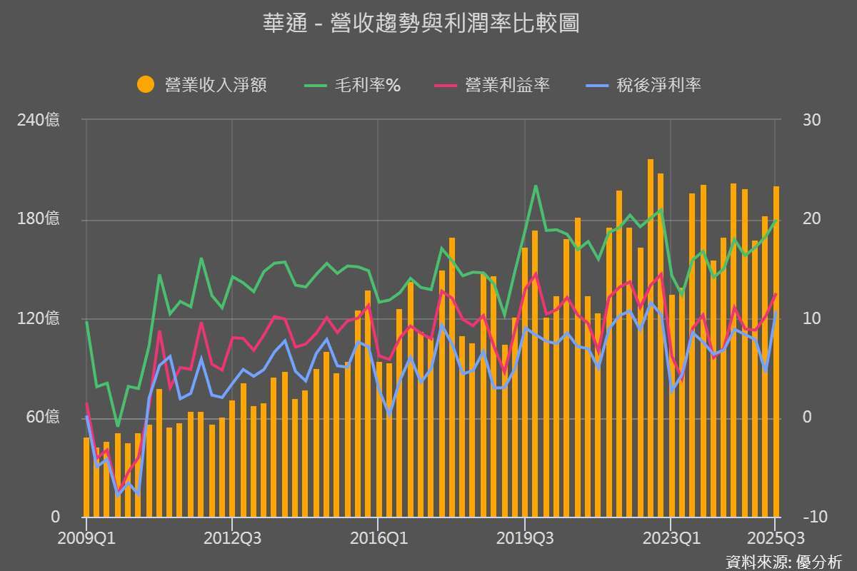 更關鍵的是,隨著低軌衛星(LEO)業務持續推進、高毛利產品比重逐步拉升,華通 2025 年前三季毛利率已由第一季的 17.17%,逐季走升至第三季的 19.95%,顯示產品結構調整,不僅支撐營收成長,也同步改善整體獲利能力。