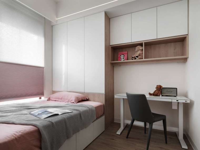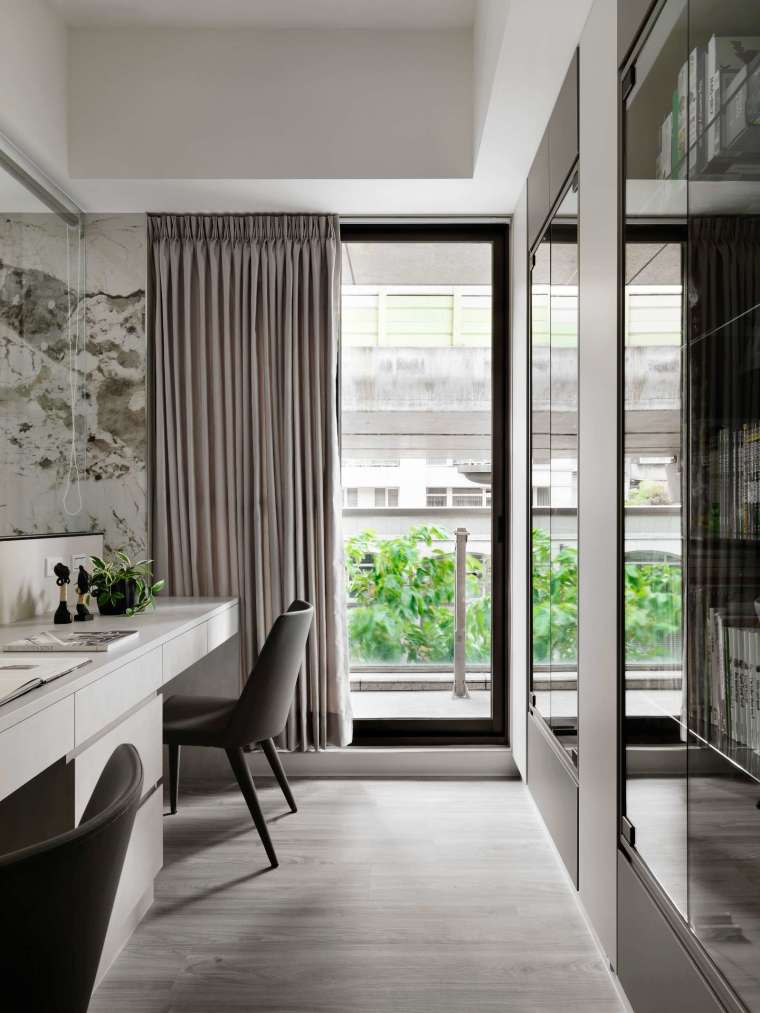 玻璃元素在空間中起著非常大的作用,例如在書房中,以「上虛下實」的方式創建隔間。陽光可以透過側邊的落地窗進入空間,卻不會過度遮擋日光,讓整個空間充滿舒適的明亮度。在廚房空間,洗手台的壁面中端安排清玻和長虹玻璃,二者可以很好地調配空間中陽光進入廚房的程度,其實也是考慮到使用者的角度,當使用者在廚房空間時,可以透過中端的玻璃窗口來了解公共區域中發生的情況。