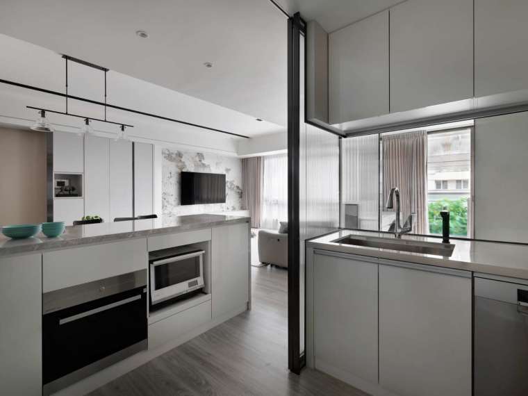將封閉式的廚房改為開放式的空間,最大的隱憂是油煙的蔓延。因此,設計師在空間中安排可滑動的玻璃門,可以根據使用者當下油煙漫射的情況進行調整。此門並不會完全阻斷廚房與公共領域的連接。想像一下,當滑門收攏時,油煙會以半徑的方式從向公共領域漫射出 3/4 的圓,但當滑門開啟時,油煙漫射程度反而會大幅降低,變成僅 1/2 的圓。最後,在廚房天花板安裝可二段式的排氣設備,因此,當有大量油煙產生時,只需拉上滑門,並開啟排氣設備,就能充分地過濾掉廚房的廢氣。