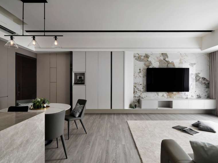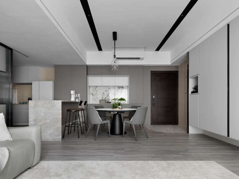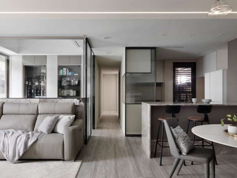 基地為中古屋,空間的使用人數為一家四口,乘載著家人對於空間的期待,業主希望住宅能夠更具現代與寬敞明亮的感受,同時,又能強化空間彼此的互動。因此,設計師為使用者規劃出半開放式的廚房空間,藉此放大採光量,同時,考慮到原先走廊的格局過於昏暗,作品利用建材與照明的重新佈置,使整個家散發出明亮清新的現代感,最後是根據業主的喜好,在細節之處添加石紋和金屬等元素,營造出一種輕奢的質感。