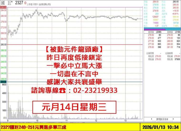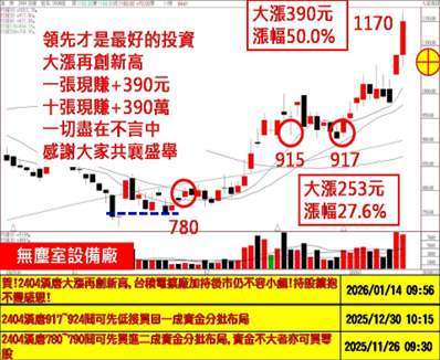 第二、AI 帶動記憶體缺貨漲價題材持續延燒擴散至矽晶圓、被動元件等族群,繼記憶體【華邦電 (2344-KY)】不到二個月財富翻倍大賺,以及群聯(8299-KY)、凌航(3135-KY)、品安(8088-KY) 等一檔接著一檔開心大賺後,接著昨日 250 元低接鎖定的被動元件龍頭【國巨(2327-KY)】,今日立馬大漲再創新高,以及昨日事前預告今日準備出手的矽晶圓【合晶(6182-KY)】,今日 37 元附近低接鎖定,立馬開心賺漲停,真的是太棒了!一切都敢講在前面,感謝大家共襄盛舉!