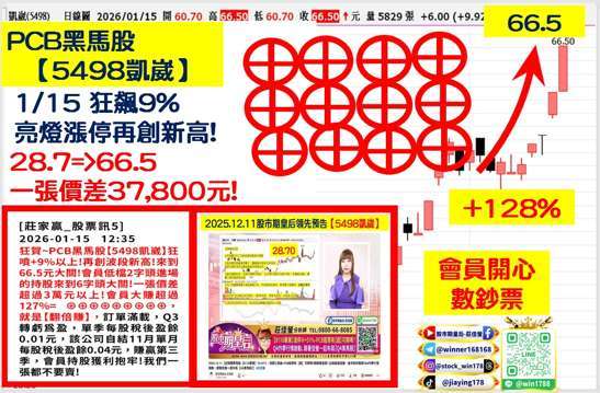 (5498-TW) 凱崴,28.7 => 66.5 領先預告後大漲 +128%,隨著 AI 伺服器與高速運算平台的快速發展,PCB 結構正經歷全面升級,這使得鑽孔製程對於精度、穩定度與耗材品質的要求大幅提高,身為關鍵零組件的鑽針,成為最先反映終端需求回溫的指標,12 月營收達 1.46 億元,年增 48.26%,公司表示,伺服器與高階板需求明確,目前月產約 1,500 萬支,並規畫在 2026 年首季擴產至 2,000 萬支以上,同時透過泰國新廠貼近客戶,隨著產品組合優化,凱崴第三季已順利轉虧為盈,營運重回成長軌道。