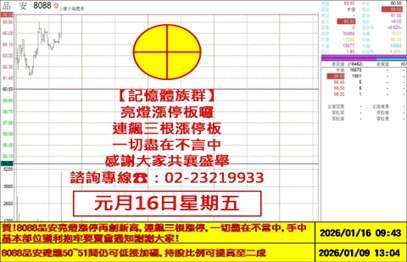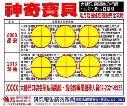 第一、隨著 AI 浪潮引動記憶體及被動元件等缺貨漲價題材股持續延燒不變,因此,繼【華邦電 (2344-TW)】不到二個月財富翻倍大賺後,接著 12/5 日 65.5 元鎖定的【凌航 (3135-TW)】不到二個月也超過 8 成,12/22 日 1150 元鎖定的【群聯 (8299-TW)】不到一個月也超過 6 成,還有 1/9 日 51 元鎖定的【品安 (8088-TW)】,送給大家的神奇寶貝,立馬現賺三根漲停板,一切都敢講在前面,相信大家都有目共賭!