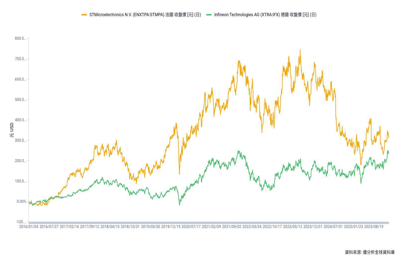 受關稅風險衝擊,義法雙掛牌的 STMicroelectronics 股價在米蘭與巴黎同步下挫 4.5%,德國 Infineon 亦下跌 3.2%。摩根士丹利指出,STM 與 Infineon 對美國市場的營收曝險比重分別約 14% 與 12%,使其對美國關稅政策變動特別敏感。